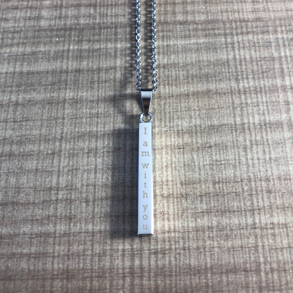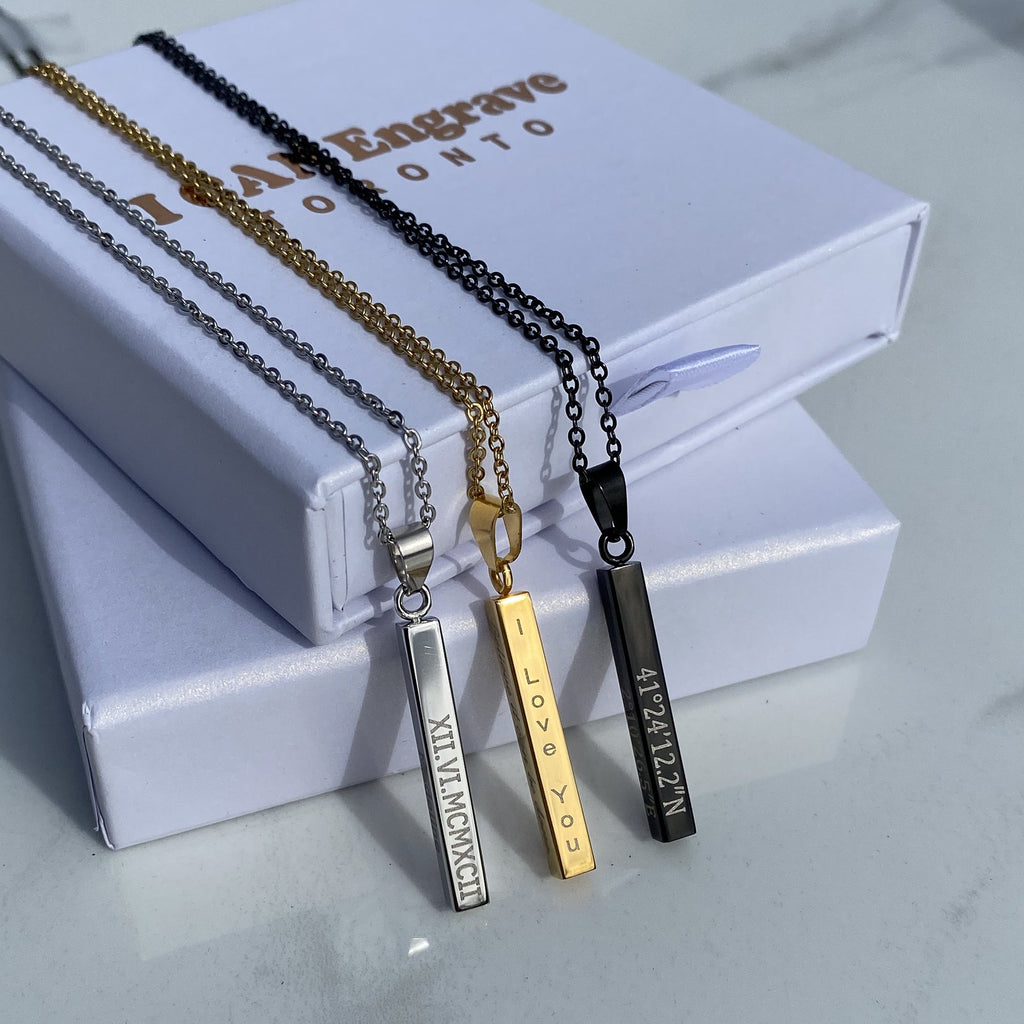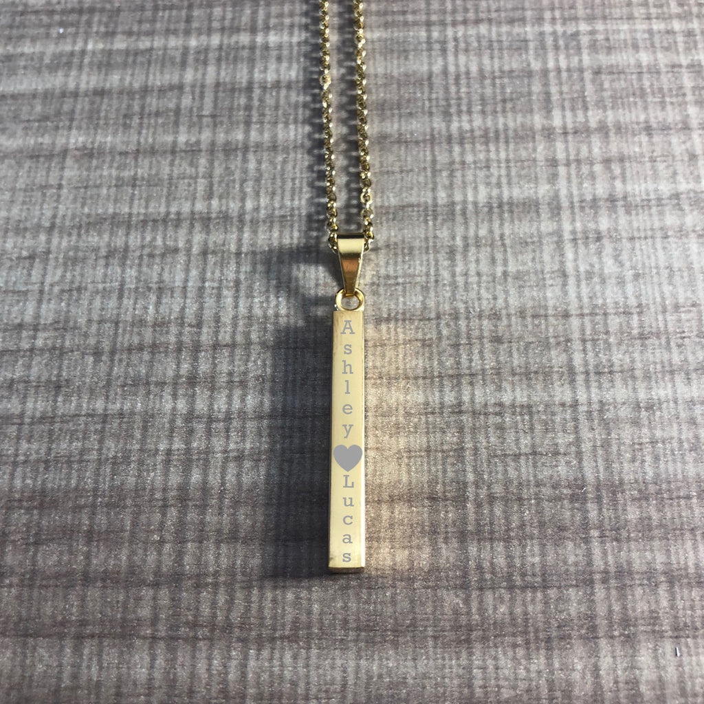 Customizable Rectangular Necklace available in the colours Black and Silver. We can engrave up to 4 sides of the necklace, depending on your wish. Prices vary for the number of sides that will be engraved. Choose which sides you want us to engrave on the necklace in the 'Sides to be engraved' menu.