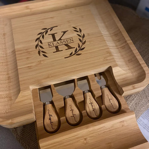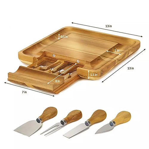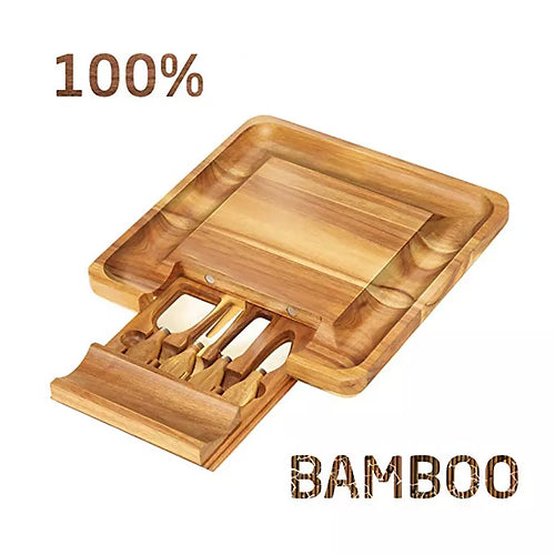 The one of a kind bamboo cheese board has an easy to clean surface that is perfect for cheese cutting. It includes 4 utensils, including fork, spreader, slicer and a knife.